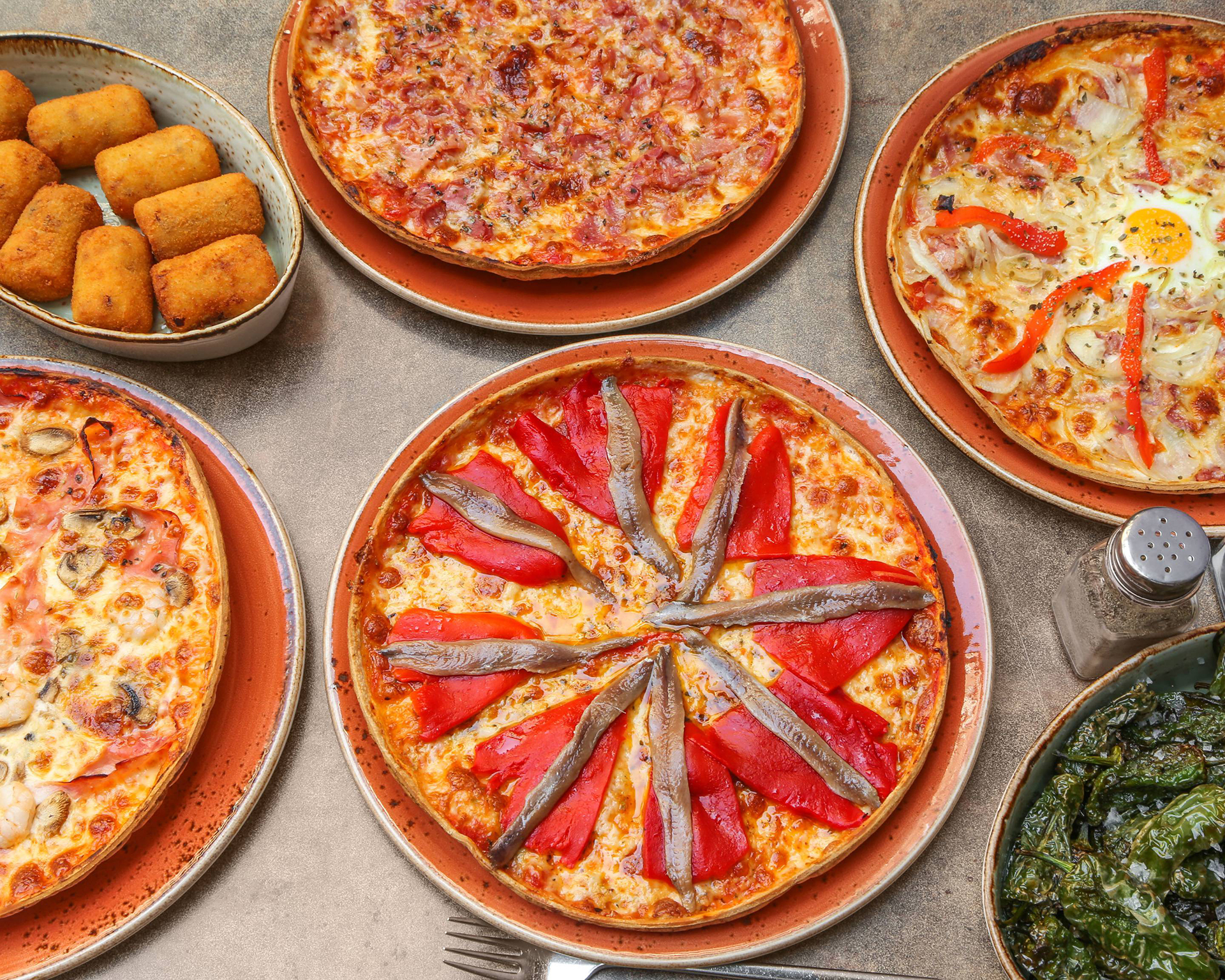 Tomate, mozzarella, gambas, mejillones, atún, berberechos, anchoas, aceitunas negras, alcaparras y orégano